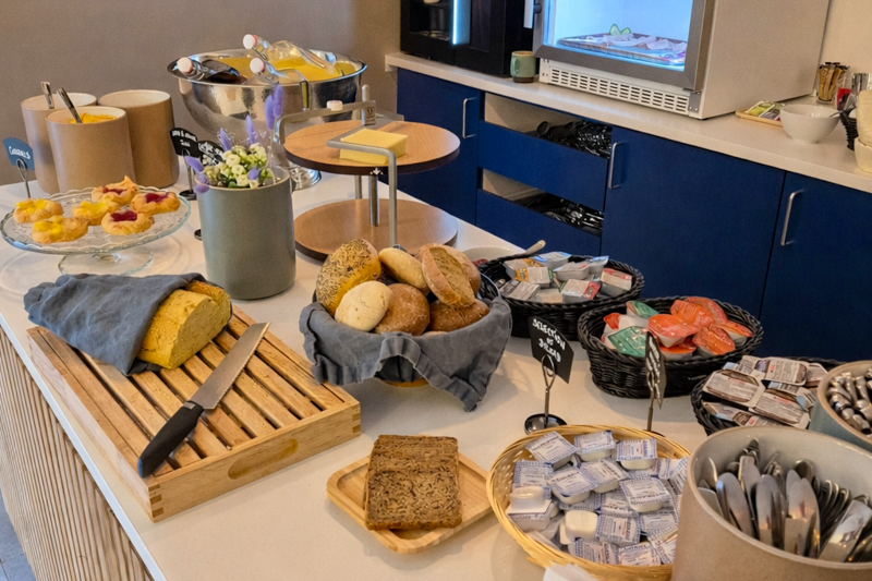 The 32 rooms share a large eating and lounge area where the complimentary breakfast is served. The hotel also serves simple options for lunch and dinner.